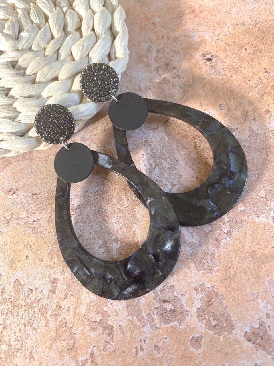 Deze supermooie zwart gemarmerde druppelvormige hangers werden gecombineerd met zwarte nikkelvrije elementen en oorstekers van hematiet die lood-, nikkel- en cadmiumvrij zijn.Licht van gewicht en ongeveer 7,5 cm lang.