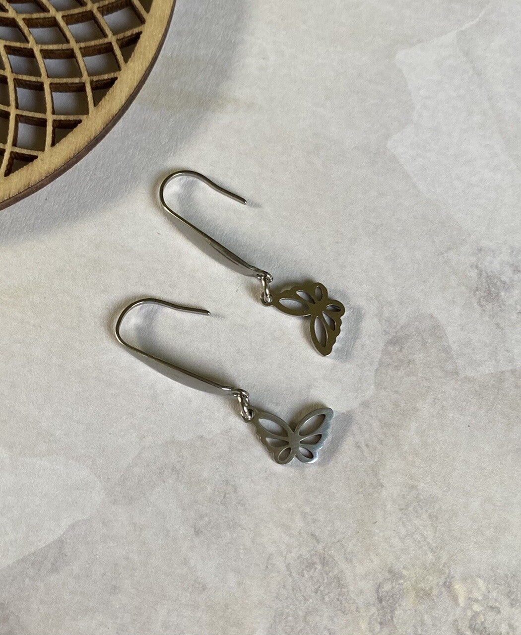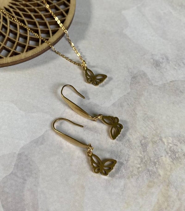 Mooie hangertjes in de vorm van een vlindertje aan oorhangers, beide van roestvrijstaal. Beschikbaar in goud en zilver.