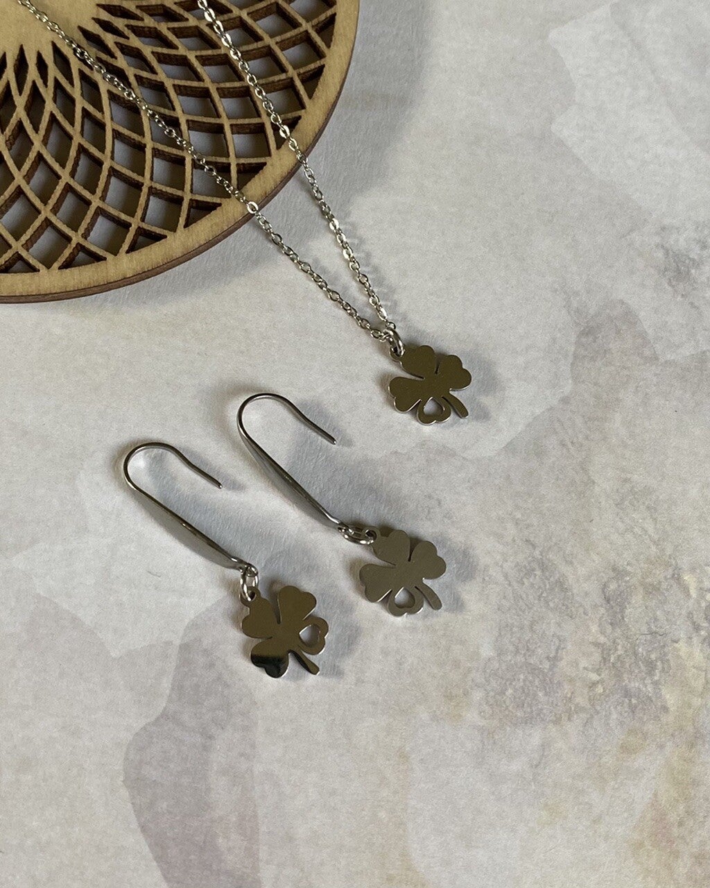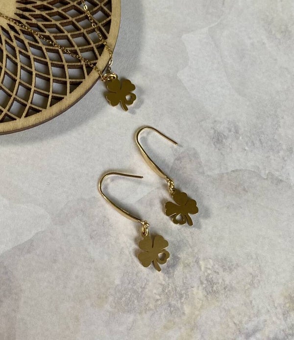 Mooie hangertjes in de vorm van een klavertje vier aan oorhangers, beide van roestvrijstaal. Beschikbaar in goud en zilver.