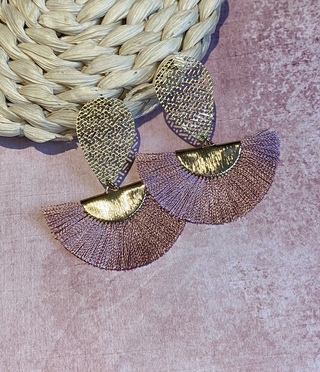 Speelse mauvekleurige waaiertjes uit brass metaal en katoen aan een goudkleurige, nikkelvrije oorsteker.
