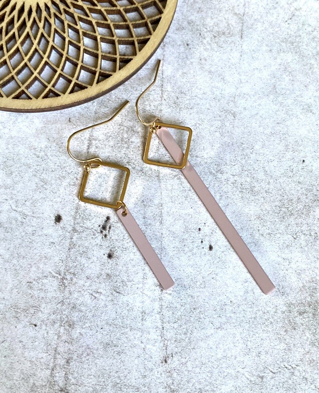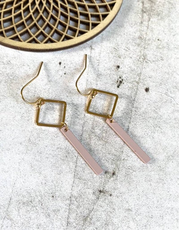 Nikkelvrije oorhangers met daaraan nikkelvrije ruitjes en staafjes met rubbercoating.