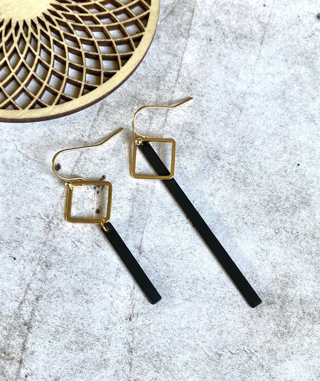 Nikkelvrije oorhangers met daaraan nikkelvrije ruitjes en staafjes met rubbercoating.