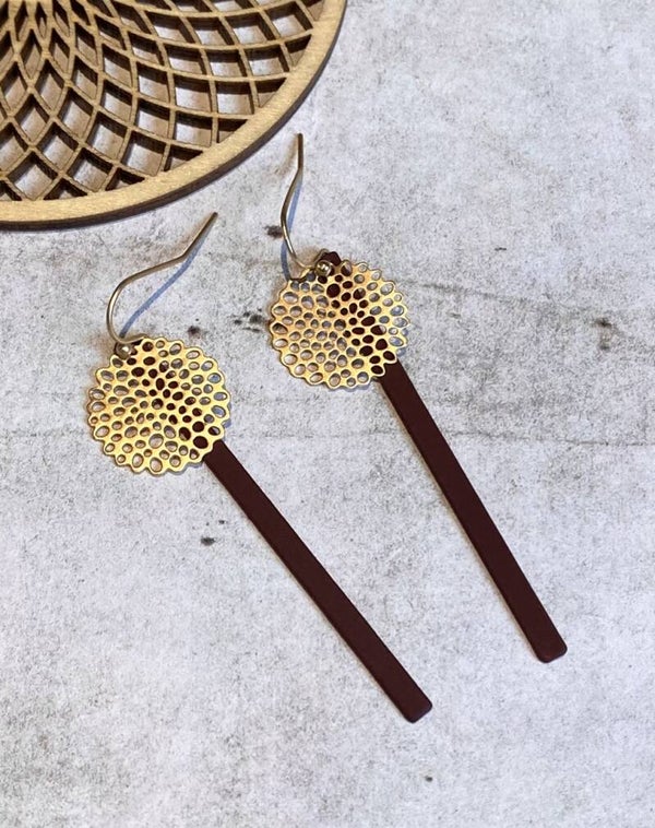 Nikkelvrije oorhangers met daaraan nikkelvrije bedeltjes in de vorm van een zonnetje en gerubbercoate staafjes.