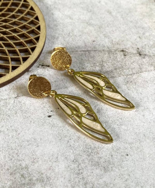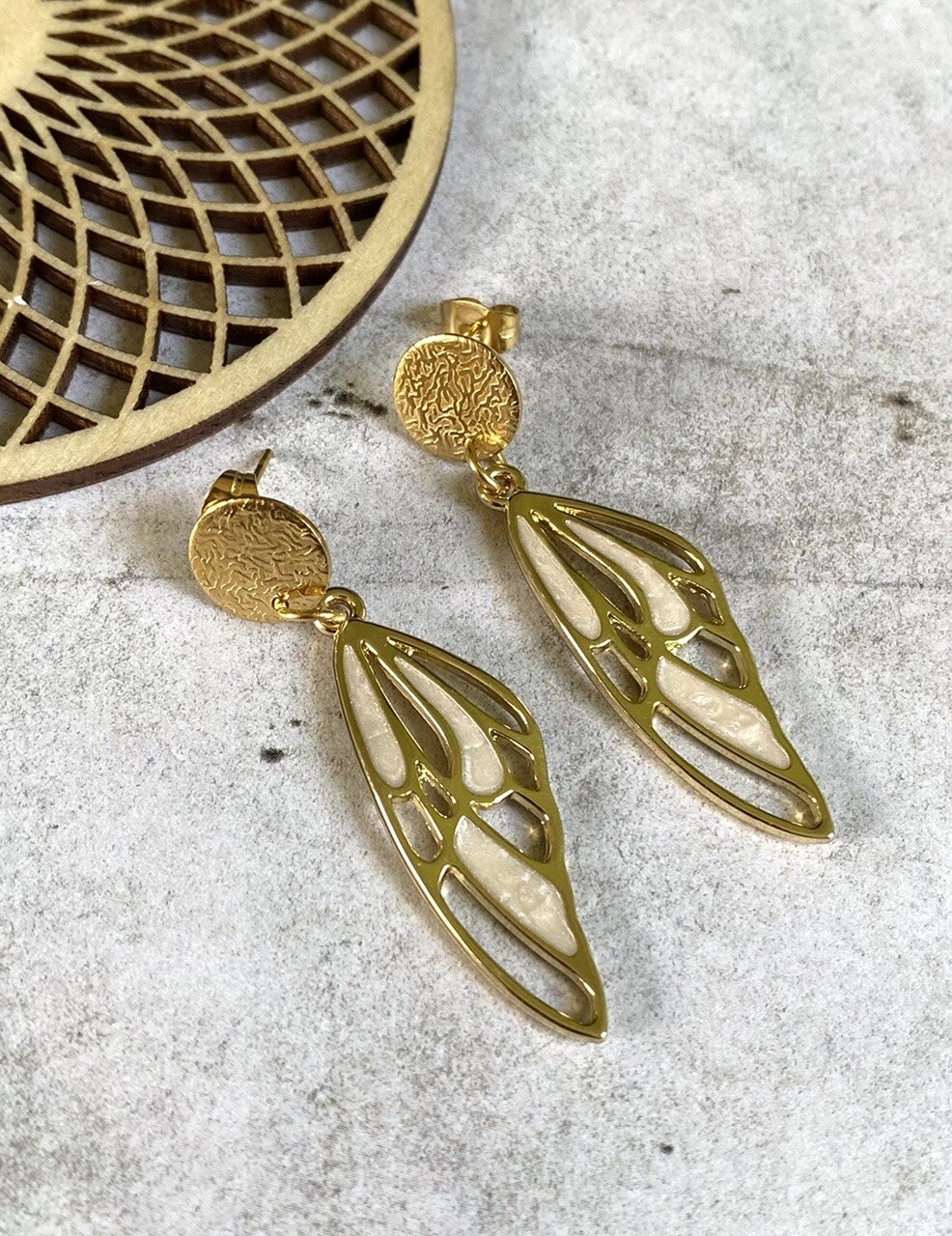 Kleine goudkleurige, nikkelvrij oorstekertjes van 10mm met subtiele reliëftekening gecombineerd met nikkelvrije hangers in de vorm van een vlindervleugeltje.