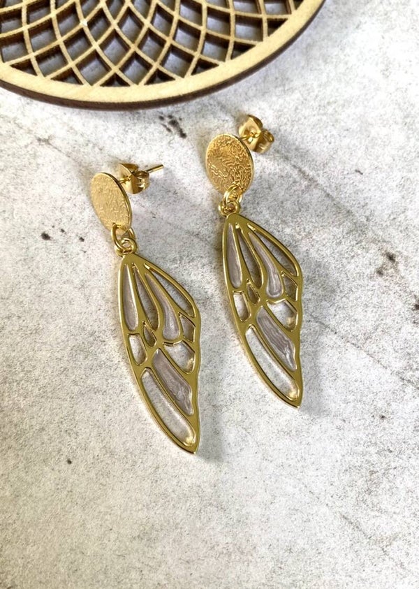 Kleine goudkleurige, nikkelvrij oorstekertjes van 10mm met subtiele reliëftekening gecombineerd met nikkelvrije hangers in de vorm van een vlindervleugeltje.