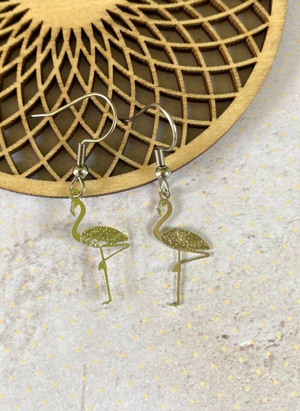 Een nikkelvrije bedel in de vorm van een flamingo aan een roestvrijstalen oorhaakje.