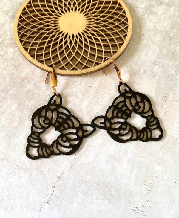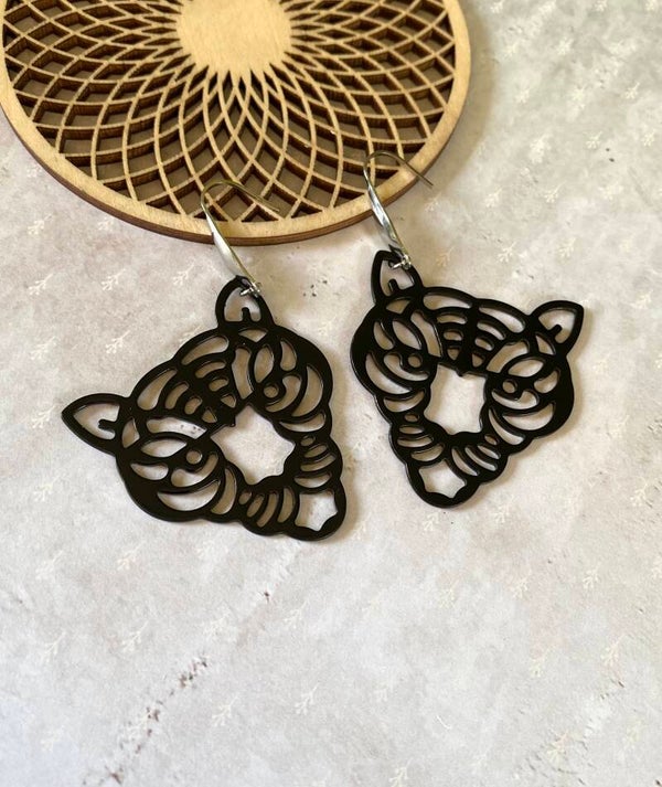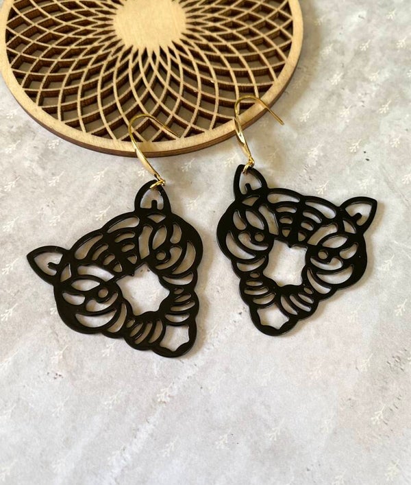 De gitzwarte nikkelvrije hangers in de vorm van een tijger hangen aan goudkleurige, rosékleurige of zilverkleurige roestvrijstalen oorhangers.