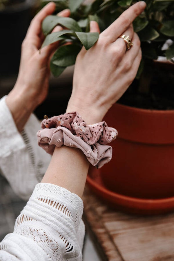 Model: Scrunchie originalMateriaal: Soepel vallende stofKleur: Licht rozeOmtrek: 12 cm