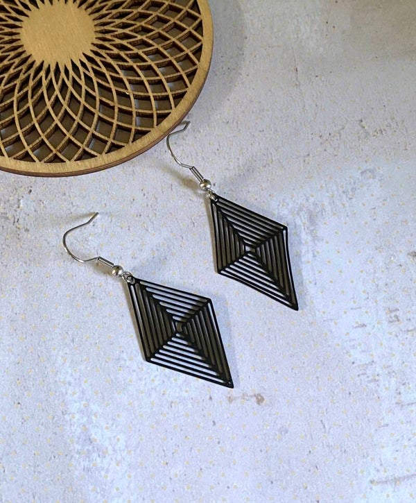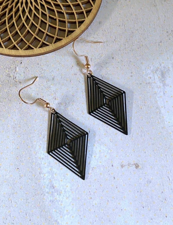 Gitzwarte, nikkelvrije hangers in ruitvorm aan een roestvrijstalen oorhaakje.Je hebt de keuze tussen een rosé, zilver -of goudkleurig haakje.