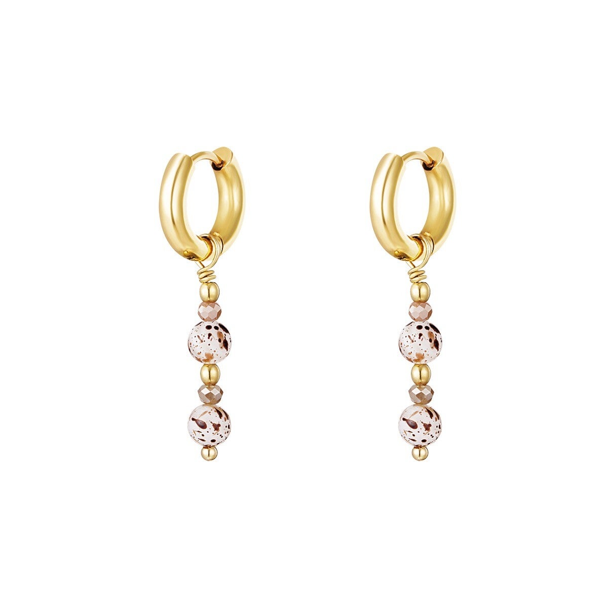 Hoe tof zijn deze gouden creolen met meerdere kralen in bruintinten. De oorbellen zijn gemaakt van stainless steel, hematiet en turquoise en hebben een lengte van 3,5 cm.