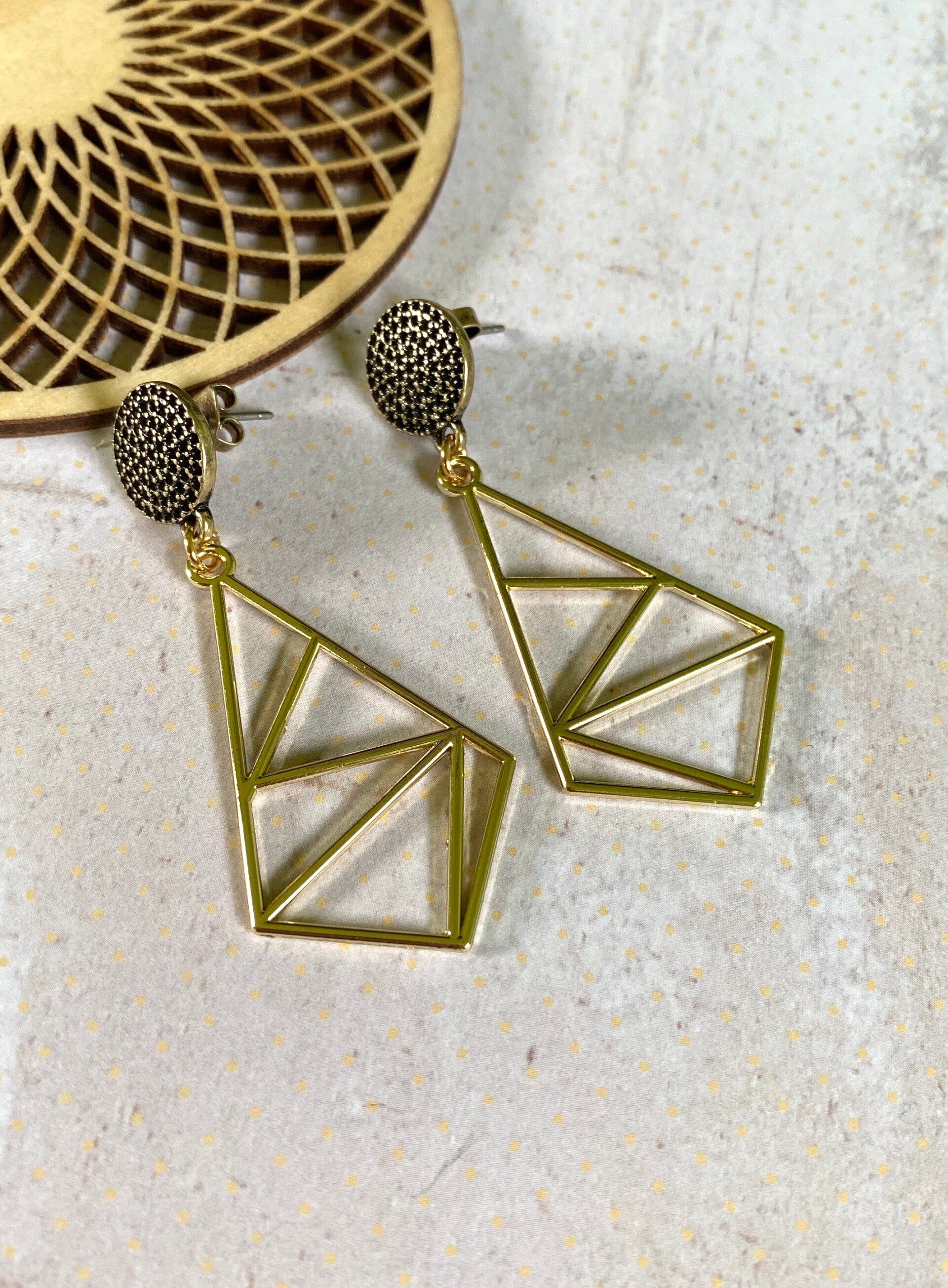 Een goud -en zwartkleurige nikkelvrije oorsteker gecombineerd met een nikkelvrije geometrische hanger.