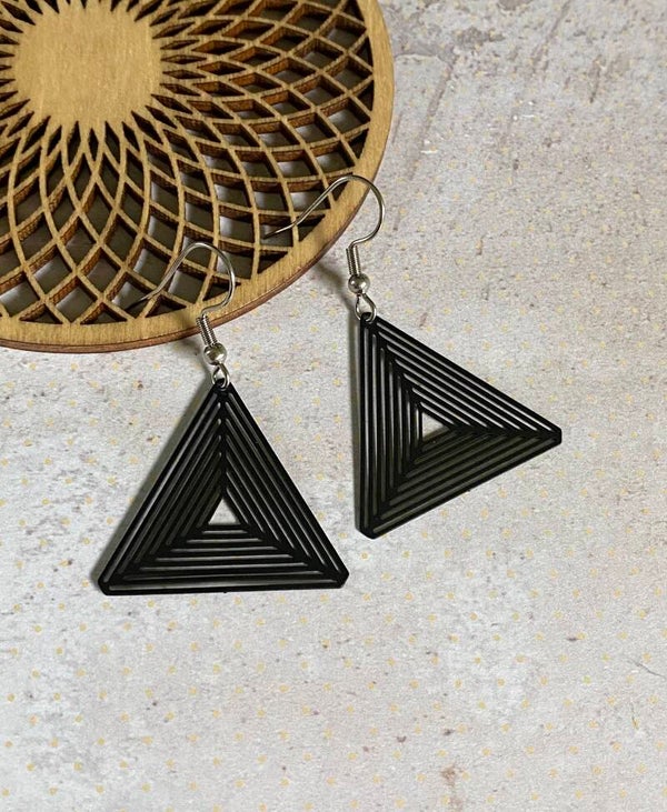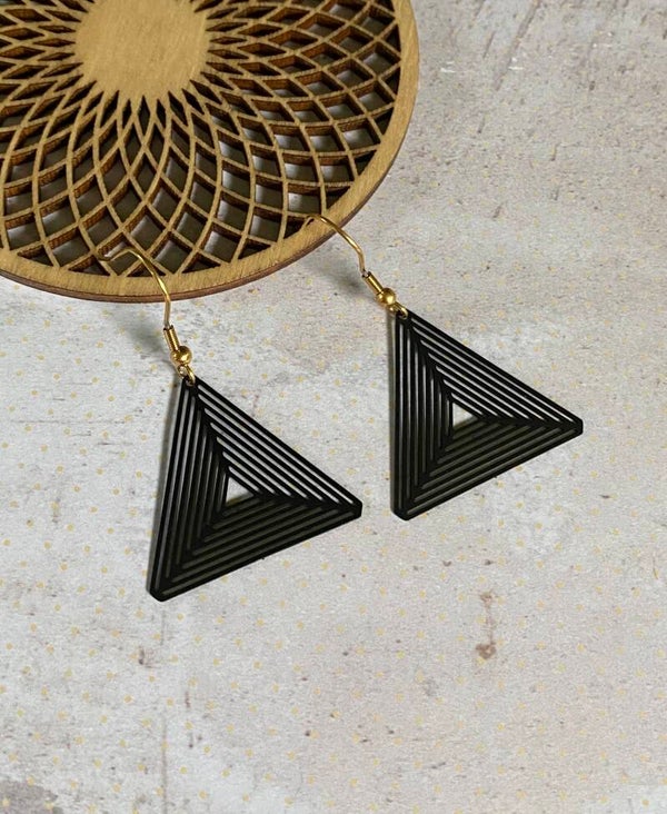 Gitzwarte, nikkelvrije, driehoekige hangers aan een roestvrijstalen oorhaakje.Je hebt de keuze tussen een rosé, zilver -of goudkleurig haakje.