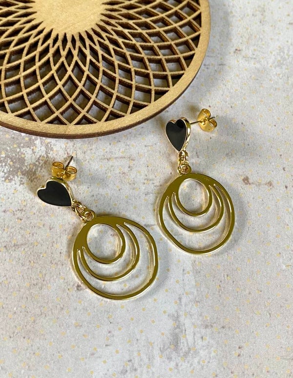 Goudkleurige nikkelvrije hangers aan hartvormige oorstekertjes in zwart en goud.Ze meten 3,5cm en dragen licht aan je oren!