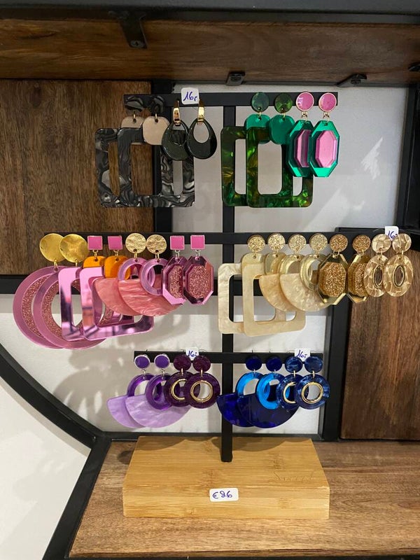 Een prachtige cobaltblauwe gemarmerde statement hanger met een metallic gedeelte werd gecombineerd met een roestvrijstalen oorstekertje aan een knopje uit plexiglas.