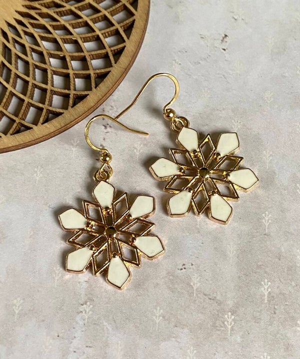 Een supermooie, nikkelvrije wit -en gouden sneeuwvlok aan een roestvrijstalen oorhaakje.