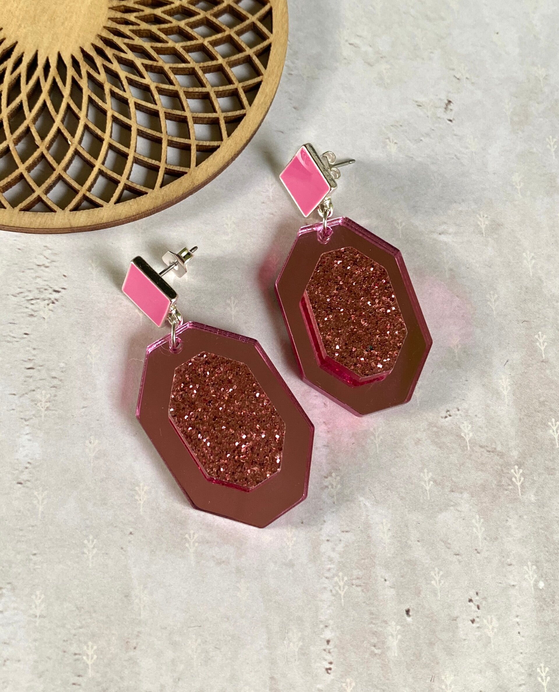 Een prachtige roze metallic statement hanger met een glitter gedeelte werd gecombineerd met een zilverkleurig, nikkelvrij, vierkantig oorstekertje met roze email.