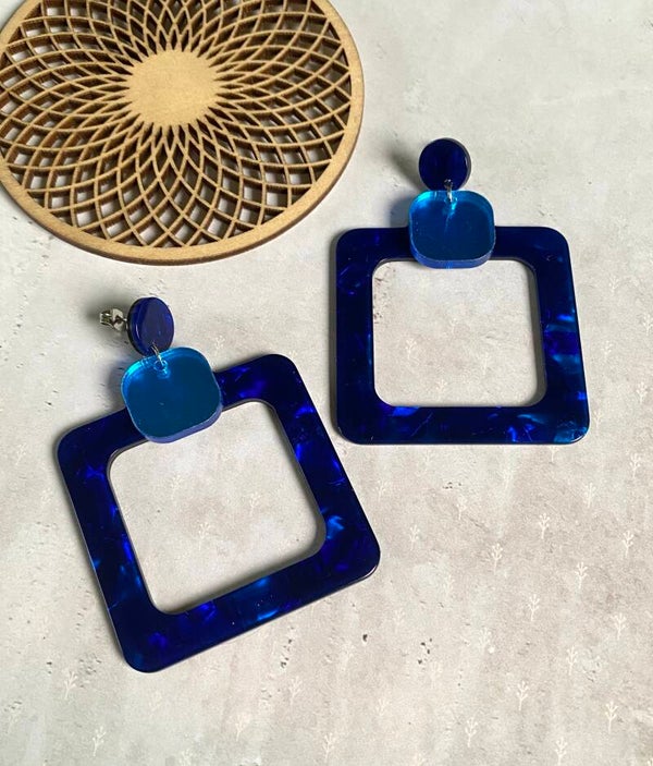 Een supertoffe blauwe gemarmerde statement hanger met een metallic gedeelte werd gecombineerd met een roestvrijstalen oorstekertje aan een blauw gemarmerd knopje uit plexiglas.