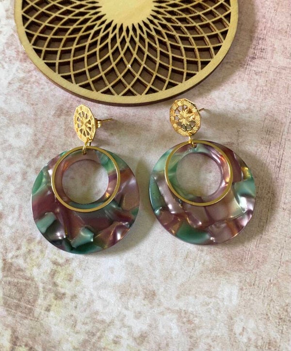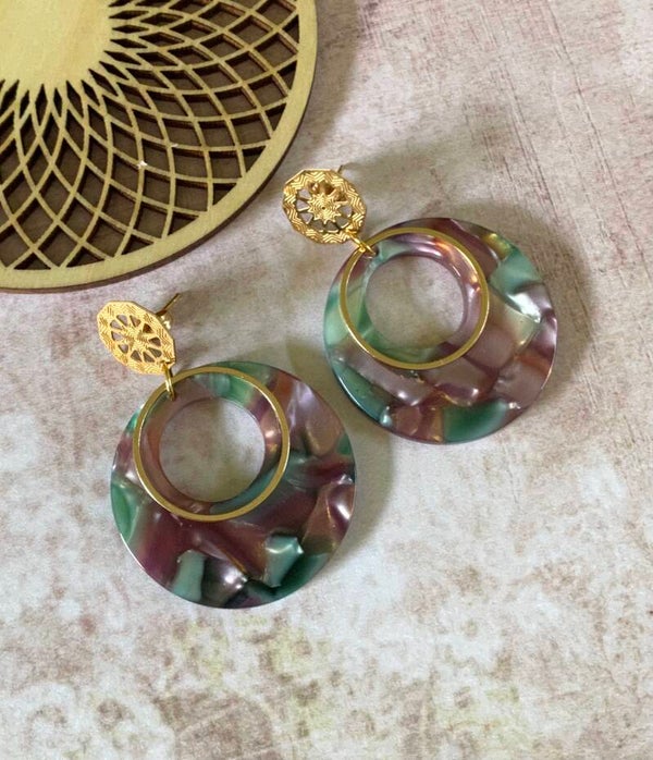 Een roestvrijstalen goudkleurige oorsteker met daaraan een mooie, groene en licht auberginekleurige gemarmerde hanger van acryl afgewerkt met een nikkelvrij element.