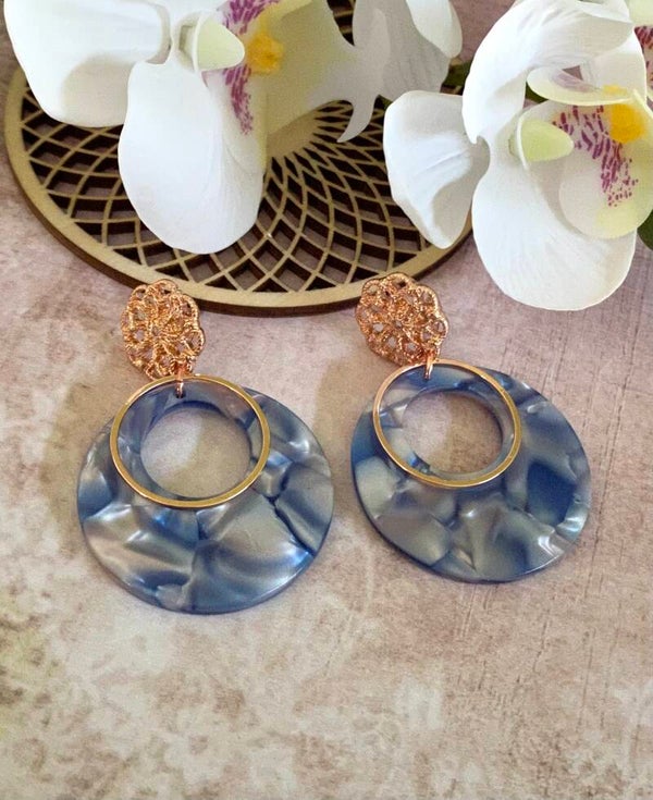 Een nikkelvrije, rosékleurige oorsteker in de vorm van een bloem met daaraan een zachte blauw en heel lichtroze gemarmerde hanger van acryl afgewerkt met een nikkelvrij element.
